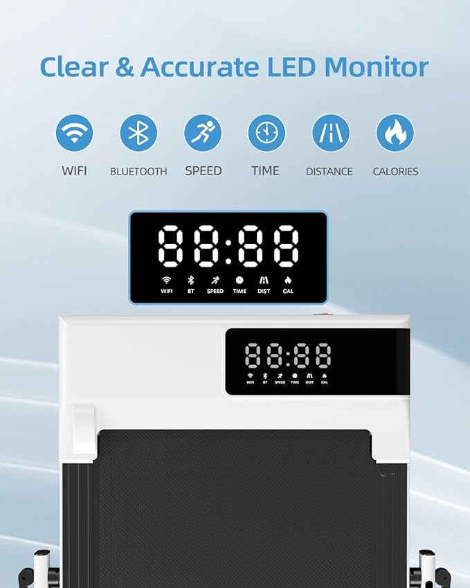 - Wider& 5-Layer Running Belt: We provide a large 43.3*16 inch area. The running belt of the home smart treadmill is longer than others, so you don't have to worry about falling, and this under desk treadmill is designed with a 5-layer anti-skid running belt, which can enhance the safety of users during exercise. This product is impeccable for both office workers and students