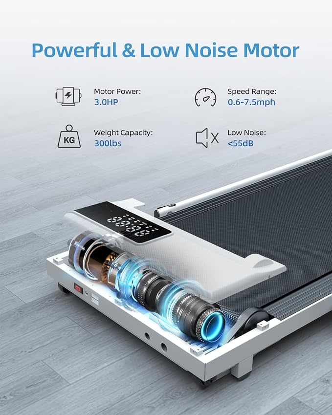 - Comfortable Running Treadmill Experience: The speed range of the under desk treadmill is 0.6-7.5mph. When the riser is folded, it can be used as a walking pad treadmill under desk at a speed of 0.6-3.8mph. When the handrail is raised, it can be used as the running speed is 0.6-7.5mph. You can use the remote control to change the speed or stop the walking pad