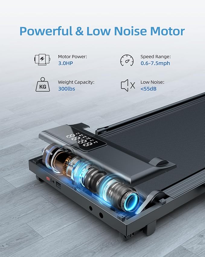 - Comfortable Running Treadmill Experience: The speed range of the under desk treadmill is 0.6-7.5mph. When the riser is folded, it can be used as a walking pad treadmill under desk at a speed of 0.6-3.8mph. When the handrail is raised, it can be used as the running speed is 0.6-7.5mph. You can use the remote control to change the speed or stop the walking pad