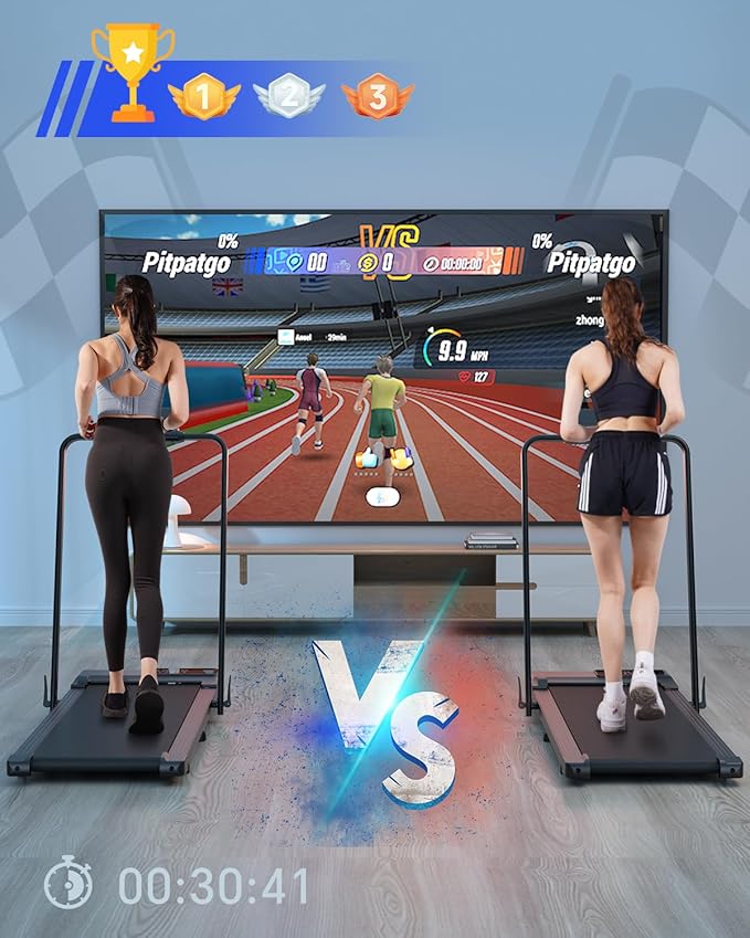 - Smart APP & LED Display: The mini treadmill features a smart APP for recording exercise data and offers virtual simulations, multiplayer connectivity, team races and rewards, enhancing workouts with interactive features and friendly competition. Even without using the APP, the small treadmill's LED display can track real-time exercise metrics such as time, speed, distance, and calories burned