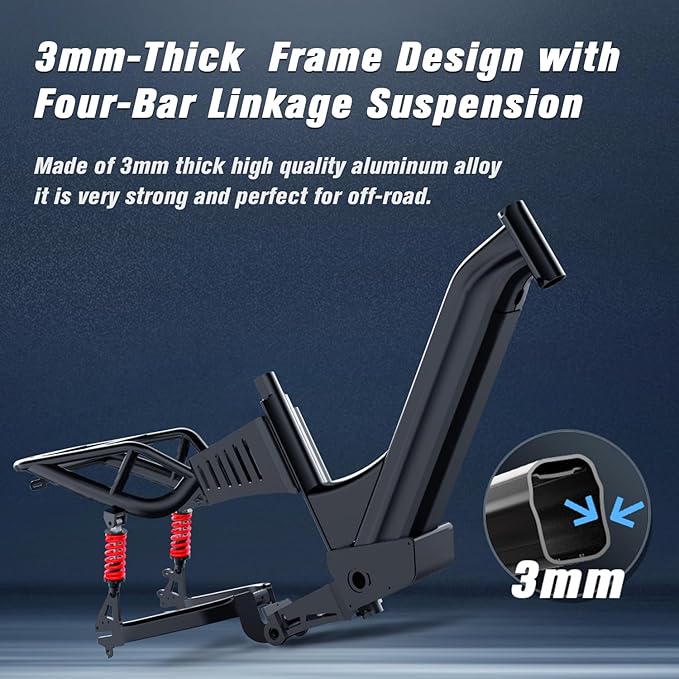 - 【𝟑𝐦𝐦 𝐓𝐡𝐢𝐜𝐤 𝐀𝐥𝐮𝐦𝐢𝐧𝐮𝐦-𝐀𝐥𝐥𝐨𝐲 𝐅𝐫𝐚𝐦𝐞】3mm (others: only 1 or 1.5mm) thickened airplane-level aluminum-alloy frame ensures a safe ride for up to 400lb riders. Sturdy and Rustless frame ensures this ebike a longer liefespan and it can accompany you to any place you want to go!