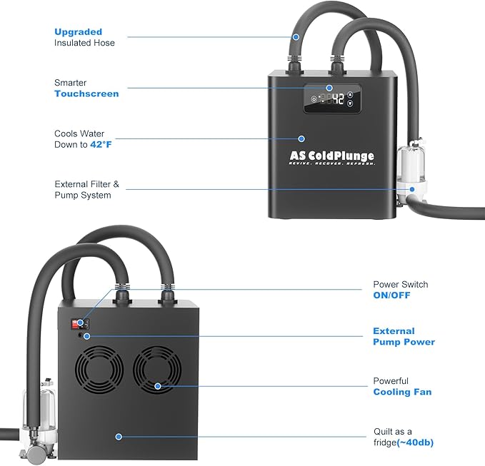 - Complete Cold Plunge Recovery Kit – No Ice Bags Needed: Skip the hassle of ice runs! This all-in-one cold plunge kit includes a powerful 1/3HP ice bath chiller with an external pump & filter system, paired with a 100-gallon insulated ice tub. Perfect for athletes, fitness recovery, and home wellness, it delivers consistent cold therapy anytime, anywhere